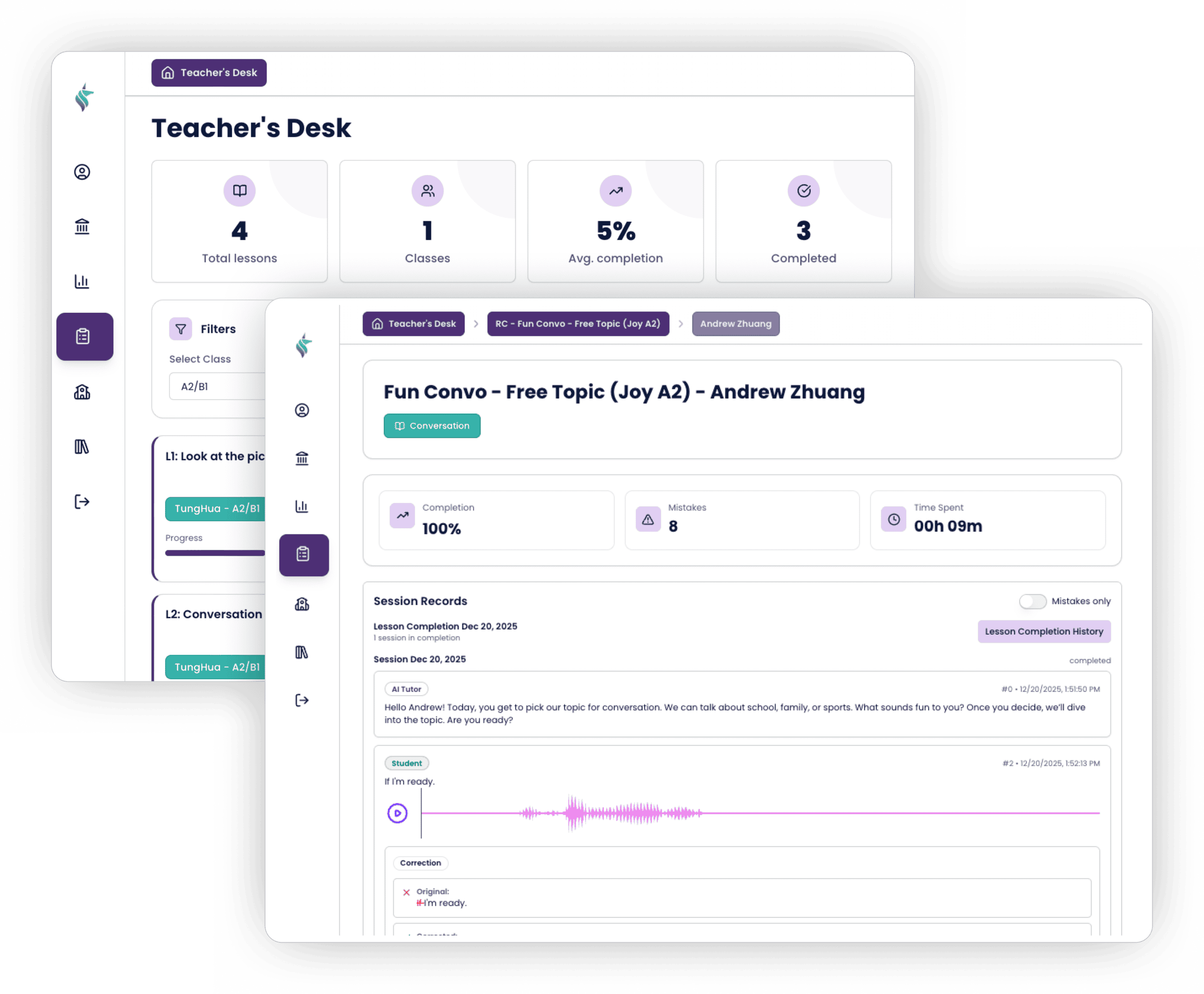Teachers can monitor student participation, speaking activity, common mistakes, and performance signals through dedicated dashboards that support more targeted reinforcement.